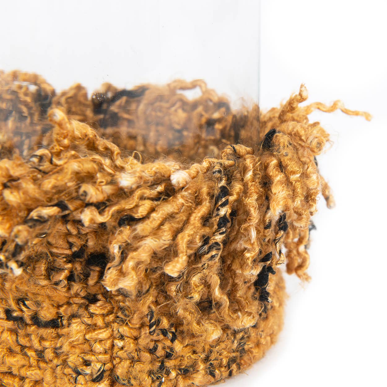 This is the larger of our Oh My Gee candle holders. Cutely housed in a hand knitted, cinnamon coloured jacket, this is the perfect candle holder for your fireplace, coffee table, centre piece or to bring some warmth to your garden on a summers evening.