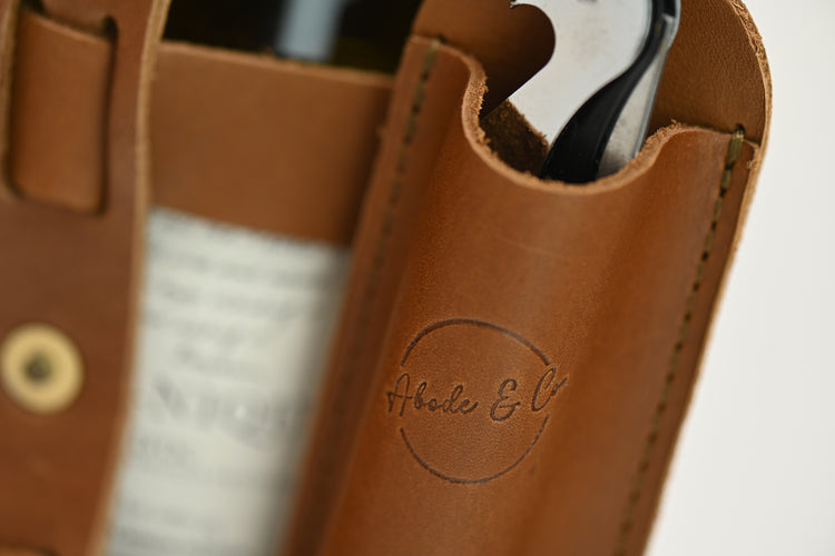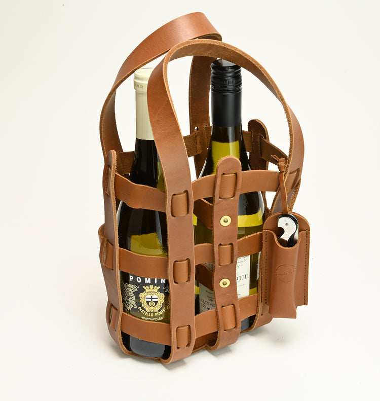 Transport your favorite wines in style with this Leather Tote Wine Carrier. Crafted from premium leather, this elegant wine tote is designed to carry and protect your wine bottles, ensuring they arrive safely wherever you're going. It also features a convenient pocket for your corkscrew, making it the perfect accessory for wine lovers on the go.