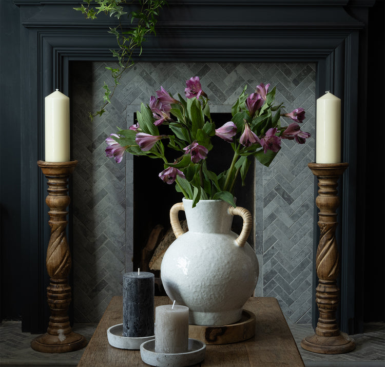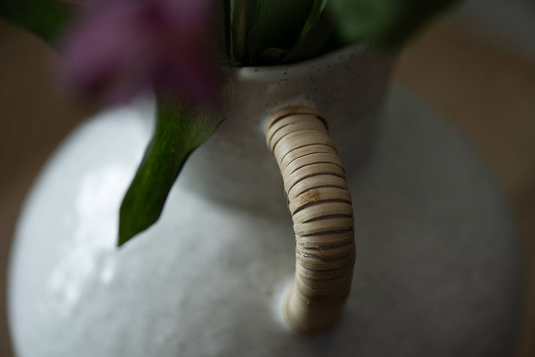 Add a touch of rustic charm to your home with the Rattan Wrapped Handle Vase from Made Market Co. This unique vase features a charming design with a distinctive rattan-wrapped handle and speckled finish, creating an eye-catching piece that brings warmth and character to any room.
