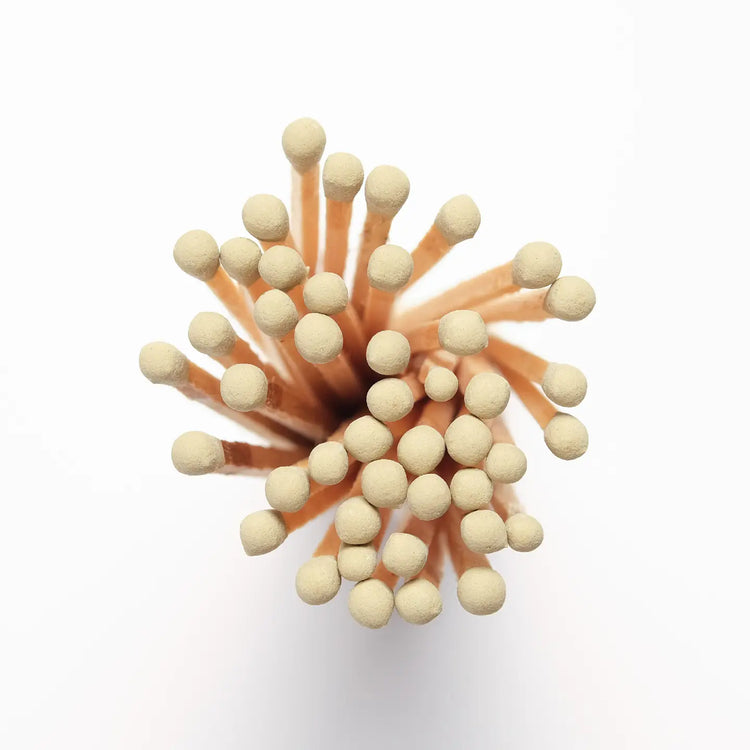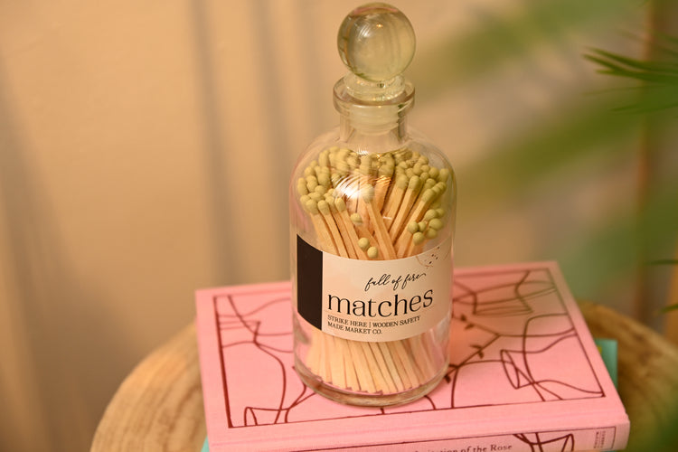 The accessory every candle lover needs to spark their senses. Housed in luxurious glass with a sleek orb top, these matches embody the 'Full of Fire' aesthetic. Each bottle is not only a visual delight but also functional, featuring a convenient striker on the label. Elevate your atmosphere with these stunning matches—where practicality meets presentation.Â